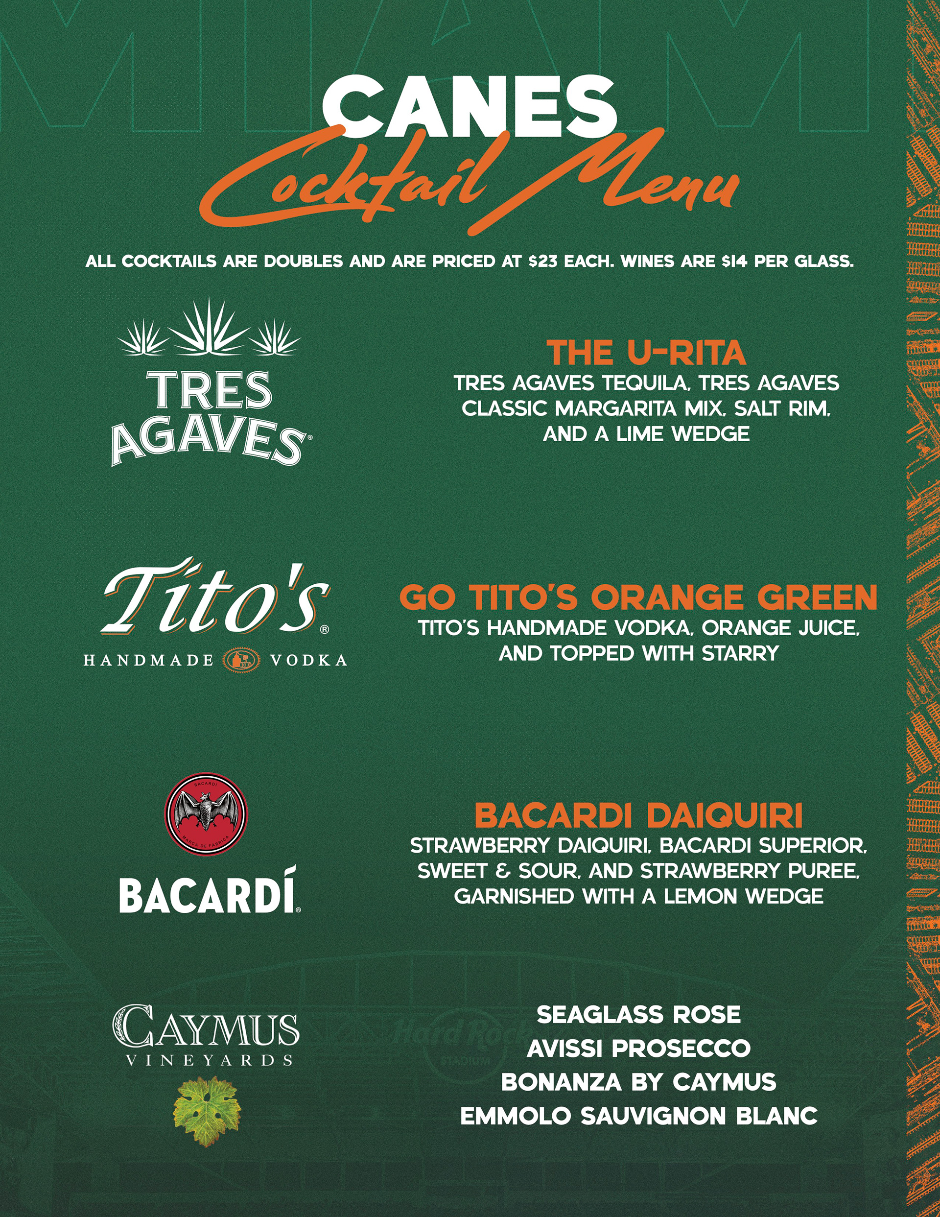 Miami Hurricanes Football cocktail menu